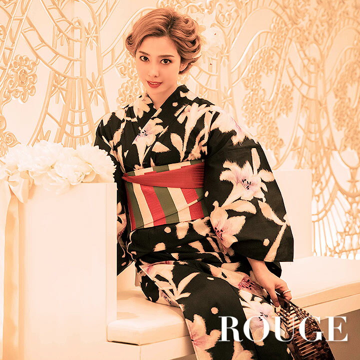 送料無料 【あす楽】【浴衣3点セット】浴衣 3点セット黒地に華やかな百合の花模様浴衣セット 黒/花柄/浴衣セット レディース【ROUGE | ルージュ】HY4147-20EK