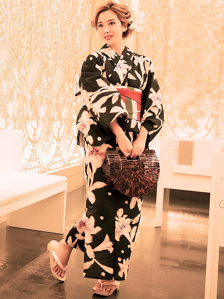 【POINT】 【浴衣】 黒地に大輪の百合の花模様が印象的で大人っぽく着こなせるデザイン。