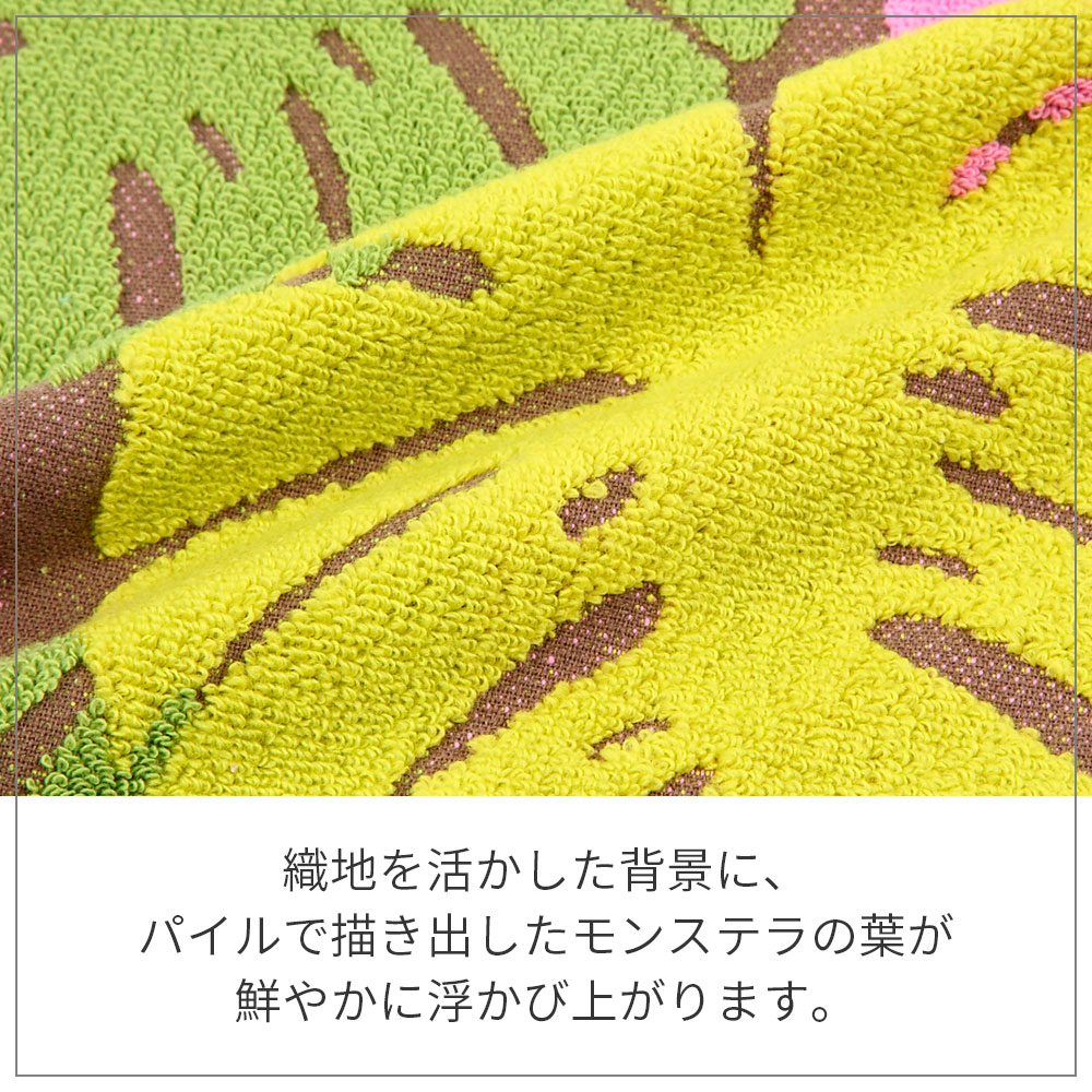 【こんな用途に】・お出掛けのとき、ハンカチがわりに・キッチンタオルとして・引越しや異動などのご挨拶に・謝恩会やパーティのプチギフトに【モチーフについて】モンステラ:驚くほど大きな葉っぱを持ち、その“実”は食べることができます、葉に穴があいているのが特徴で、穴から先が見通せることから、縁起の良い植物だといわれています。