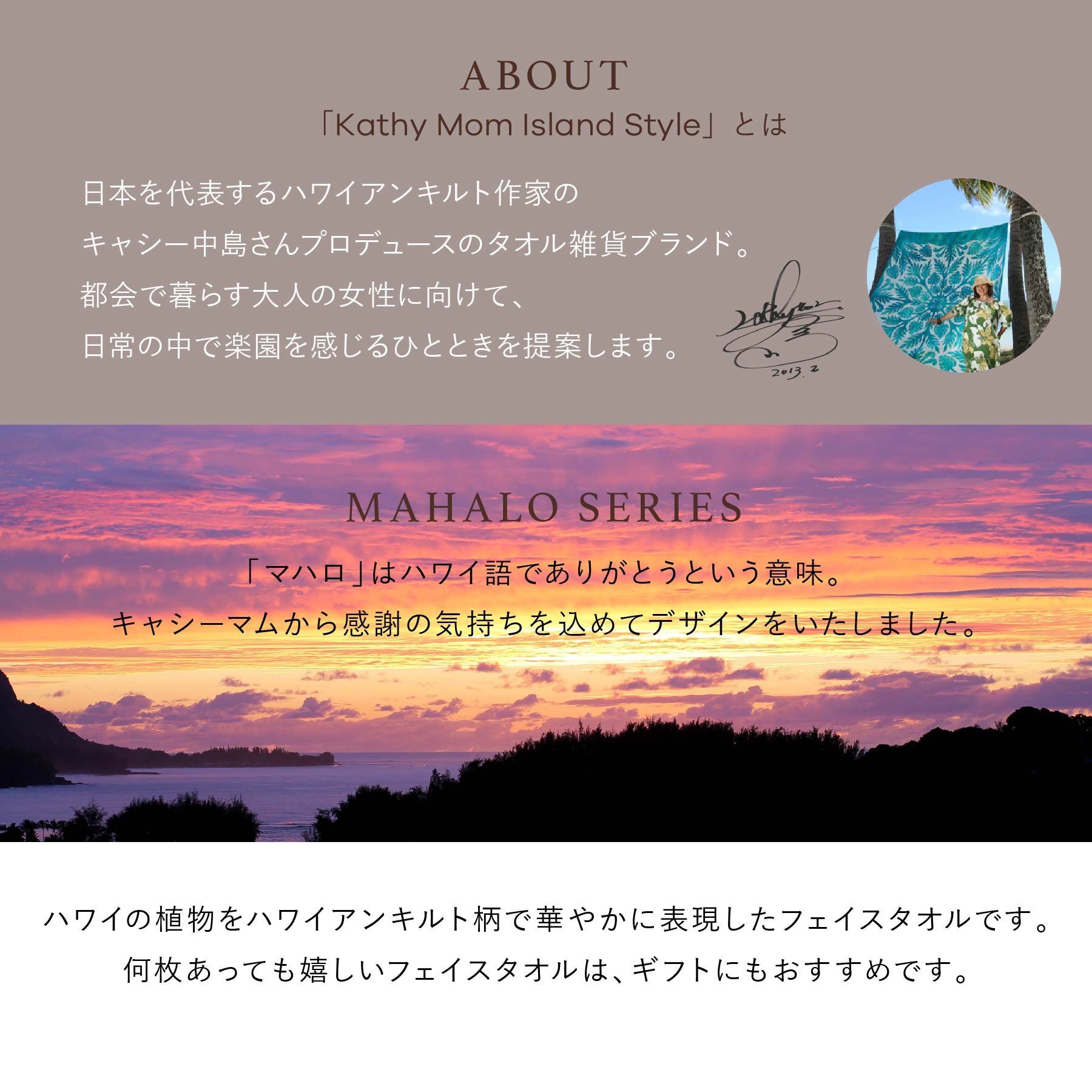 ハワイアンキルト作家、キャシー中島さんプロデュースの、ハワイの代表的な植物をモチーフにした、リゾート感あふれるハワイアンキルト柄フェイスタオルです。